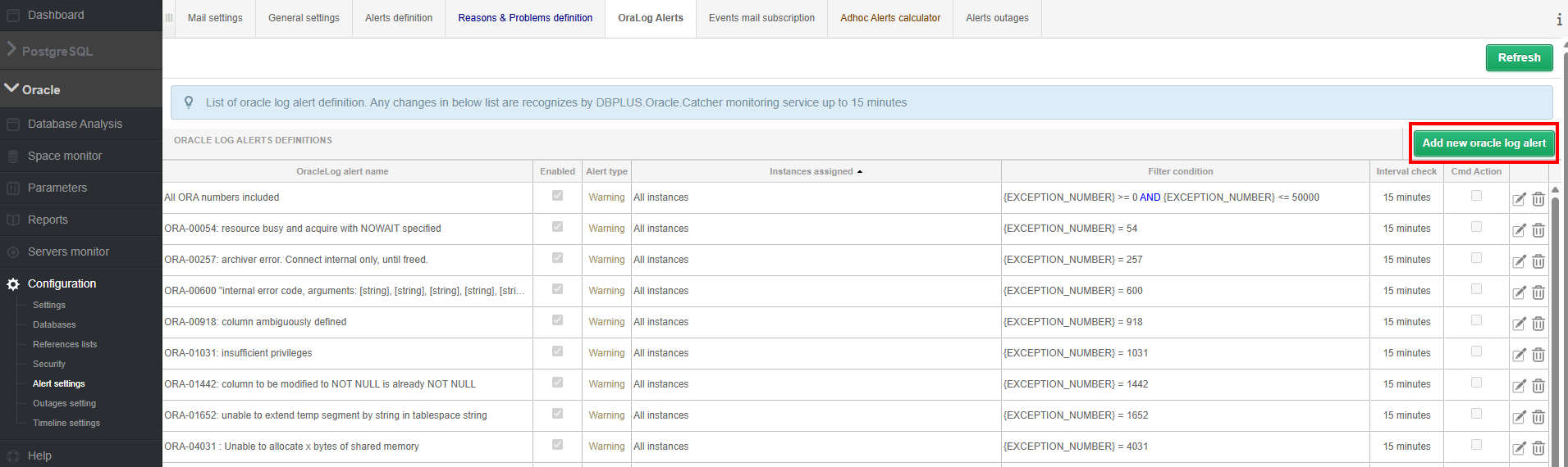 Równolegle wprowadziliśmy szereg usprawnień w obszarze alertów opartych na Oracle Alert Log. Konfiguracja alertów jest dostępna w menu konfiguracji Oracle Alert Log, a dodatkowo można nią zarządzać bezpośrednio z poziomu ekranu logów za pomocą przycisku Manage Alerts. Nowa wersja umożliwia definiowanie alertów jednocześnie dla wielu instancji lub całych kategorii instancji, a także stosowanie bardziej zaawansowanych filtrów warunkowych z wykorzystaniem operatorów LIKE,AND, OR i NOT. Administrator może również określić częstotliwość sprawdzania logu oraz liczbę wystąpień zdarzenia wymaganą do wywołania alertu, co pozwala ograniczyć liczbę fałszywych alarmów i lepiej dopasować mechanizm detekcji do specyfiki środowiska. Dodatkowo dla każdego alertu można skonfigurować akcję wykonywaną po jego wystąpieniu, wykorzystując komendy CMD lub PowerShell, z możliwością użycia tagów uzupełnianych automatycznie w momencie wyzwolenia alarmu. To rozszerzenie sprawia, że monitoring Oracle Alert Log staje się nie tylko źródłem informacji diagnostycznych, ale również elementem aktywnej automatyzacji reakcji na zdarzenia.