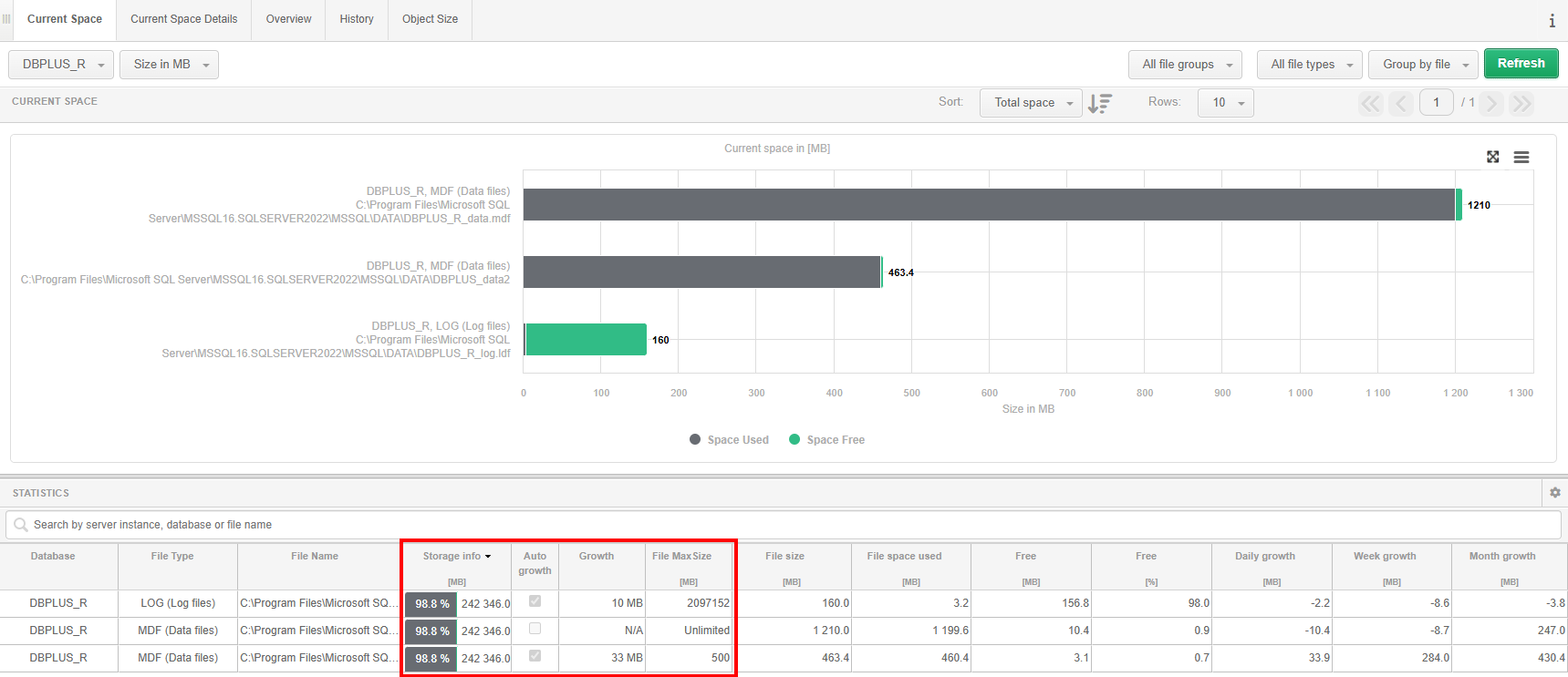 W najnowszej wersji DBPLUS Performance Monitor rozszerzyliśmy monitoring zajętości plików baz danych w SQL Server o szczegółowe informacje związane z mechanizmem Autogrowth. Użytkownik może teraz sprawdzić na poziomie szczegółów plików, w widoku Group by file, nie tylko bieżący rozmiar plików danych i logów, ale również parametry takie jak Auto growth, Growthoraz Max size. Dodatkowo aplikacja zbiera informacje o dostępnej przestrzeni dyskowej dla woluminów, na których znajdują się pliki danych i logów, co pozwala lepiej ocenić rzeczywiste możliwości dalszego wzrostu bazy. Dane te są widoczne zarówno w zakładce Current Space w menu Space Monitor, jak i na poziomie historii,dzięki czemu administrator może analizować nie tylko stan bieżący, ale również zmiany zachodzące w czasie.