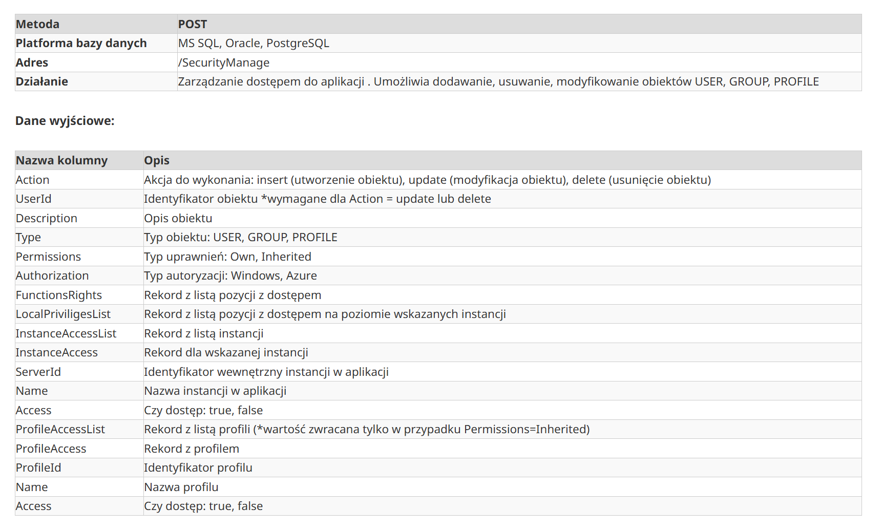 W najnowszej wersji DBPLUS Performance Monitor rozszerzyliśmy możliwości REST API o dwie istotne funkcje, które zwiększają zakres integracji aplikacji z systemami zewnętrznymi i automatyzacją procesów administracyjnych. Pierwsza z nich to zarządzanie dostępem do aplikacji, które umożliwia pobieranie informacji o użytkownikach, grupach i profilach oraz zdalne dodawanie, modyfikowanie i usuwanie obiektów odpowiedzialnych za uprawnienia. Funkcjonalność została udostępniona poprzez nowe ścieżki /userlist oraz /SecurityManage, dostępne dla środowisk MS SQL, Oracle i PostgreSQL. Dzięki temu administratorzy mogą nie tylko odczytywać aktualną konfigurację dostępu, ale również zarządzać nią programistycznie, z poziomu zewnętrznych narzędzi lub własnych procesów automatyzujących administrację środowiskiem DBPLUS. API obsługuje zarówno użytkowników i grupy z uprawnieniami własnymi, jak i obiekty korzystające z uprawnień dziedziczonych z profili, zachowując pełną kontrolę nad zakresem dostępu do instancji i funkcjonalności aplikacji.